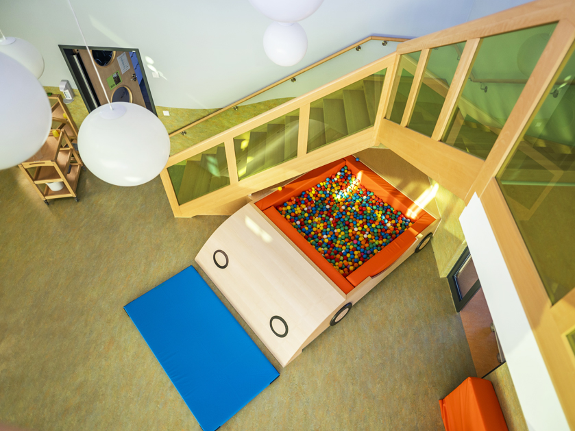 Unser Haus bietet viel Platz für die individuelle Entwicklungsbegleitung eines jeden Kindes. Da wir aufgrund guter räumlicher Gegebenheiten so viele Möglichkeiten zur Bewegung haben, ist dies ein Schwerpunkt unserer pädagogischen Arbeit. In vielen Räumen bieten Schaukeln, Wahrnehmungsbecken, Podestlandschaften und Fahrzeuge unterschiedliche Bewegungsanlässe, so dass sich jedes Kind nach seinem individuellen Entwicklungsstand ausprobieren und erleben kann. Die Kindertagesstätte ist in gleich große Gruppentrakte aufgeteilt, die durch einen Spielbereich miteinander verbunden sind.