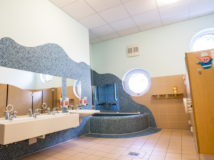 - einen Materialraum, eine Garderobe und einen Waschraum mit Wickeltisch