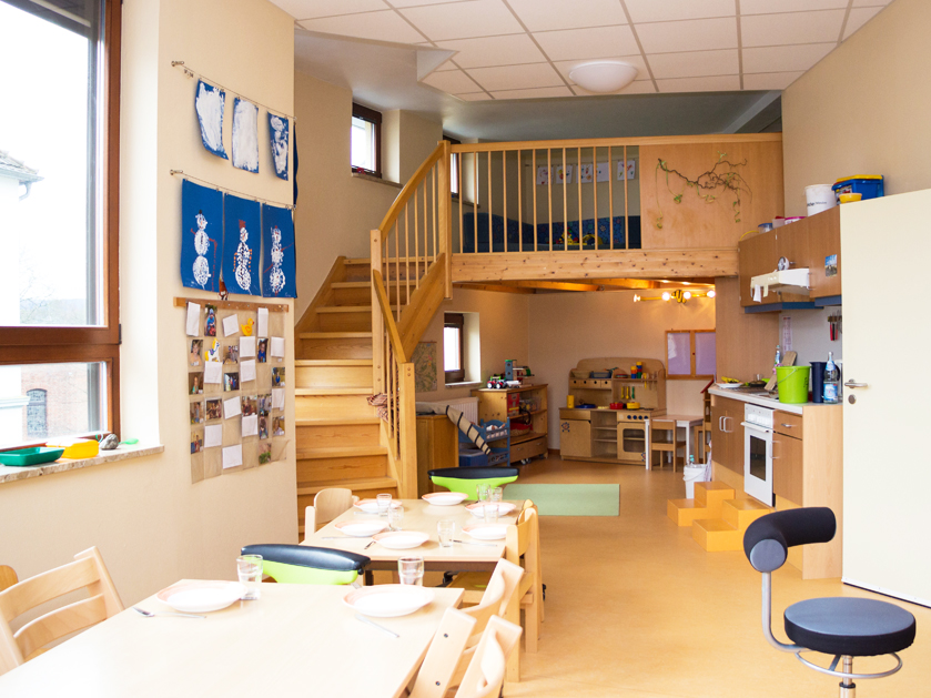 - Gruppenraum: mit 2. Spielebene, Bauteppich, Kuschelecke, Kreativbereich, Essbereich und eigener Küchenzeile