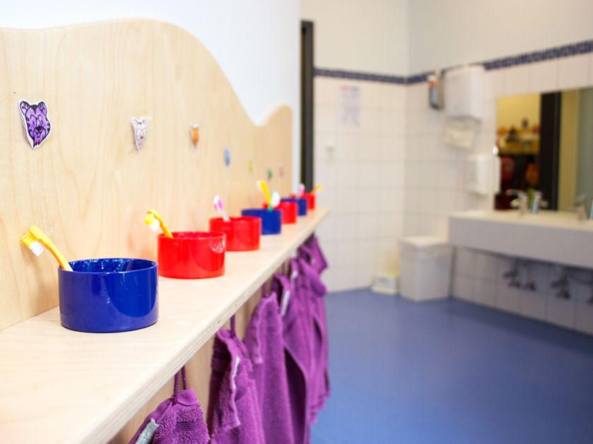 - Waschraum: mit großem Wickeltisch, Waschrinnen auch zum Experimentieren